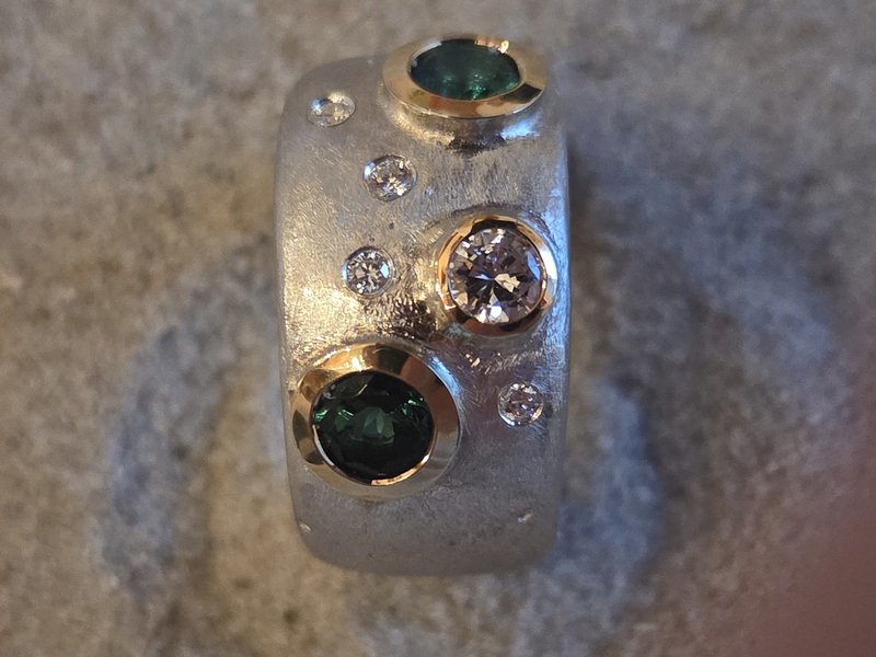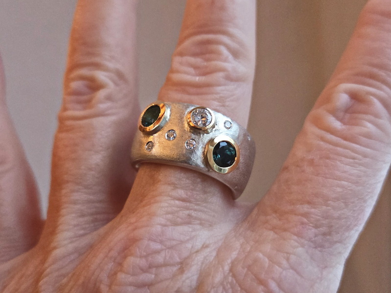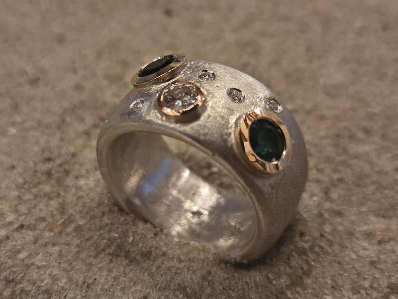Dieser Gussring ist aus 925er Silber und hat Steinfassungen aus 750er Gelbgold.