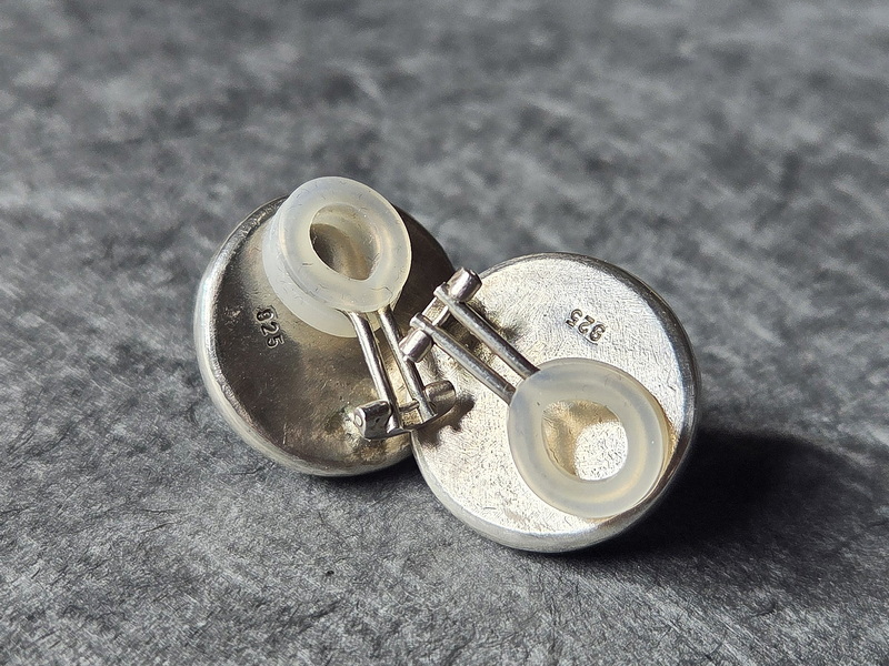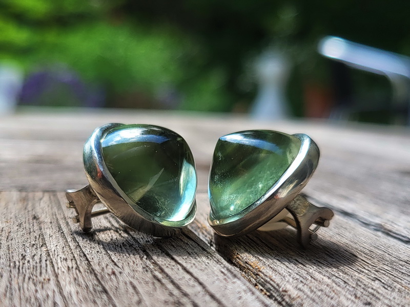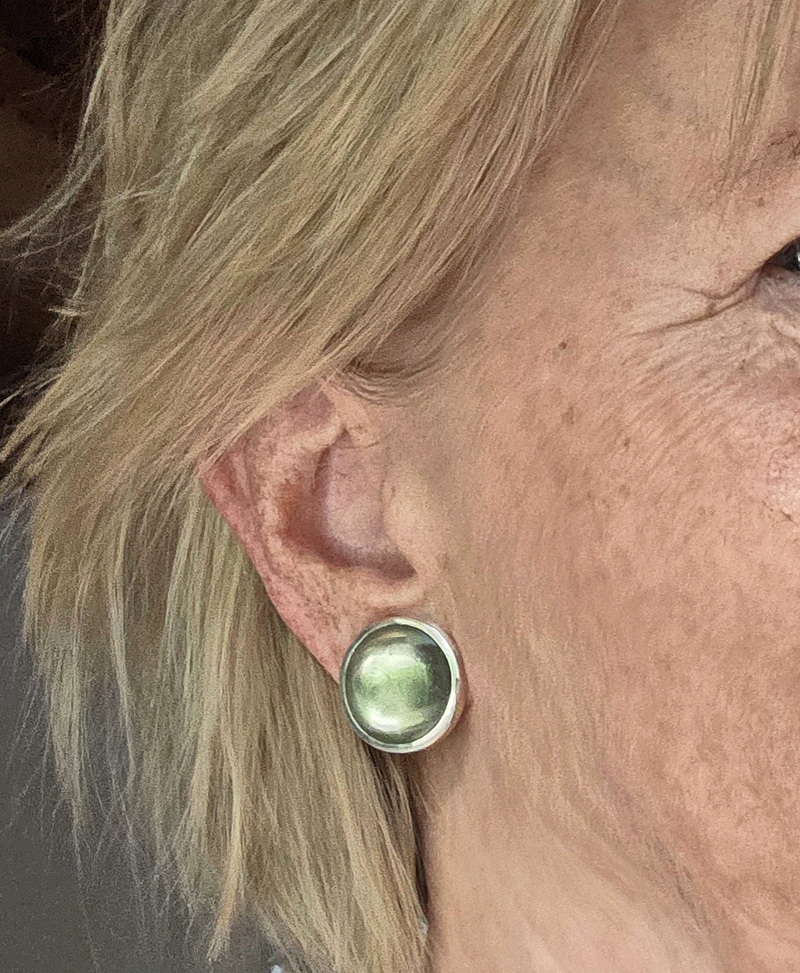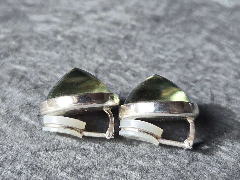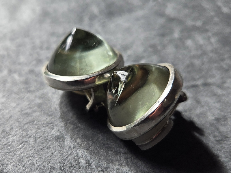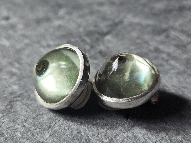 Diese Ohrclipse sind aus 925er Silber  gefertigt, mit zwei Prasiolithen im Cabochon-Schliff rund, 20 mm Durchmesser. Die Mechanik ist mit weichen Kunststoff-Ringen verstärkt, das garantiert einen guten und festen Sitz, ohne dass die Clipse drücken – auch nach stundenlangem Tragen nicht.